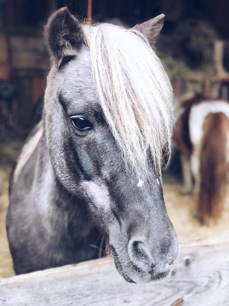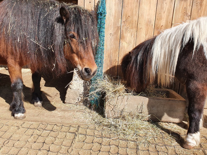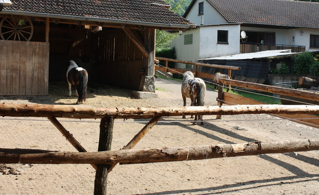 Wir besitzen 6 Ponys, ein schönes großes Paddock, eine riesige Sommerweide mit Hütte und Bachlauf, sowie einen kleinen Reitzirkel und eine kleine Bewegungshalle.